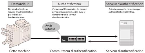 Gère toutes les informations d'authentification par l'intermédiaire du serveur d'authentification (RADIUS : Remote Authentication Dial In User Service, Service utilisateur entrant d'authentification à distance) et authentifie le requérant. Il est possible d'interdire un accès non autorisé parce que seul le demandeur authentifié par le serveur RADIUS est autorisé à se connecter au réseau par l'authentificateur.