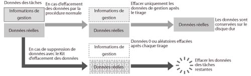 La machine sépare les données des tâches en informations de gestion et en données, et elle les stocke sous cette forme lors de la copie, de l'envoi, de la réception et de l'impression. Les informations de gestion sont effacées automatiquement une fois la tâche terminée, mais les données sont stockées sur le disque dur.