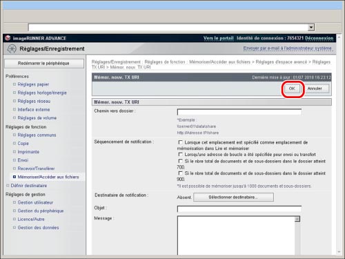La notification est envoyée chaque fois qu'un fichier est enregistré dans le dossier spécifié dans l'espace avancé à partir de [Lire et mémoriser] sur l'afficheur tactile. En revanche, la notification n'est pas envoyée lorsqu'un fichier est enregistré dans un sous-dossier ou qu'un dossier y est ajouté.