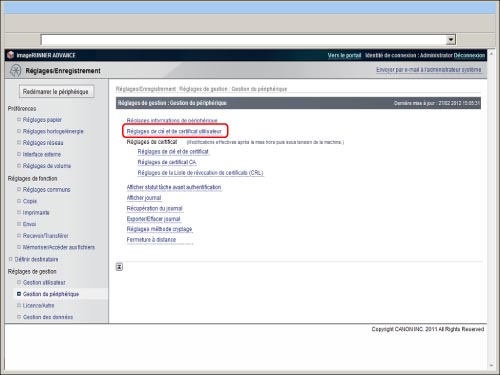 Cliquer sur [Réglages de clé et de certificat utilisateur].