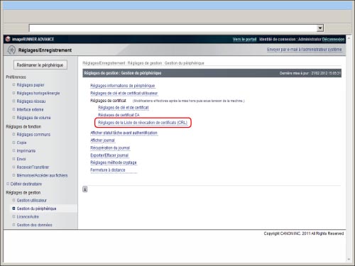 Cliquer sur [Réglages de la Liste de révocation de certificats (CRL)].