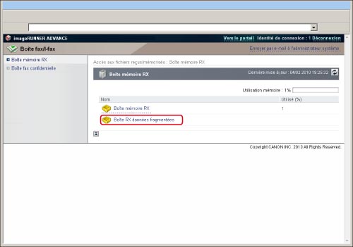 Cliquer sur [Accès aux fichiers reçus/mémorisés] → [Boîte mémoire RX] → [Boîte RX données fragmentées].