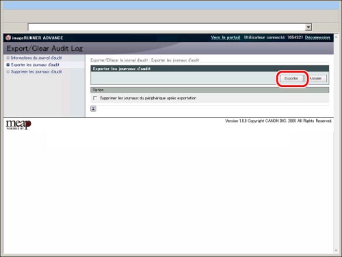 Si [Supprimer les journaux du périphérique après exportation] est sélectionné, veiller à sélectionner [Mémorisation] après avoir cliqué sur [Exporter]. Si [Annuler] est sélectionné, les journaux seront supprimés sans être enregistrés.