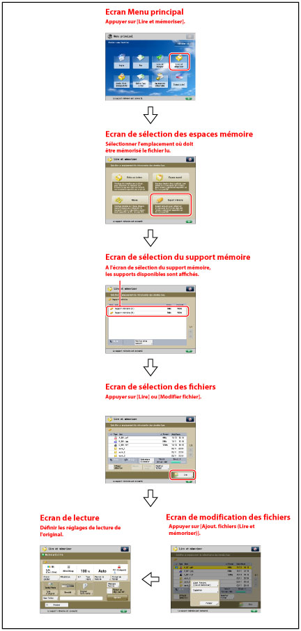 Pour plus d'informations sur l'agencement des dossiers, la modification/suppression des fichiers et l'obtention d'informations détaillées sur les fichiers, voir "Accès aux fichiers enregistrés".