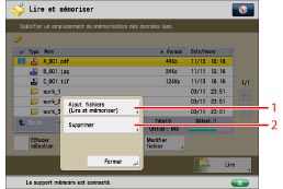 Pour supprimer les fichiers mémorisés sur le support mémoire. Il est possible de sélectionner et de supprimer jusqu'à 32 fichiers simultanément.
