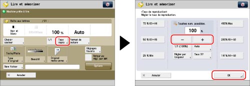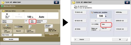 Il est possible de régler la machine de sorte qu'elle définisse automatiquement le taux de reproduction, ou de spécifier un taux manuellement.