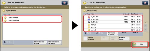 Sélectionner l'espace souhaité → le répertoire de destination → appuyer sur [Lire].