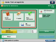 Les destinations suivantes ne peuvent pas être modifiées si un type de destination est défini sur "Oui" dans [Limiter nouveau destinataire]. Sélectionner un destinataire mémorisé à l'aide de Local Address Book, Remote Address Book, Serveur LDAP sous [Carnet d'adresses], ou en appuyant sur un bouton de composition une touche sous [1 touche]. (Voir "Restriction de la fonction d'envoi".)