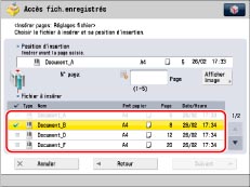 Lorsque plusieurs fichiers sont sélectionnés et que l'on appuie sur [Insérer pages], le fichier inséré devient le fichier sélectionné (mis en surbrillance).