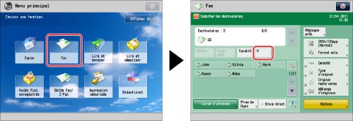 La touche R n'apparaît pas lors de l'utilisation de la fonction Fax avec le Kit Remote Fax. Il convient dans ce cas de saisir le numéro de composition externe au lieu d'appuyer sur la touche R.