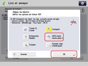 Sélectionner [PDF] → [OCR (recherche de texte possible)] → [OK] → [OK].