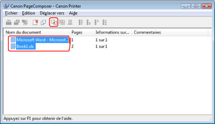 Sur la liste [Nom du document] de la boîte de dialogue [Canon PageComposer], sélectionner les documents à fusionner → cliquer sur [