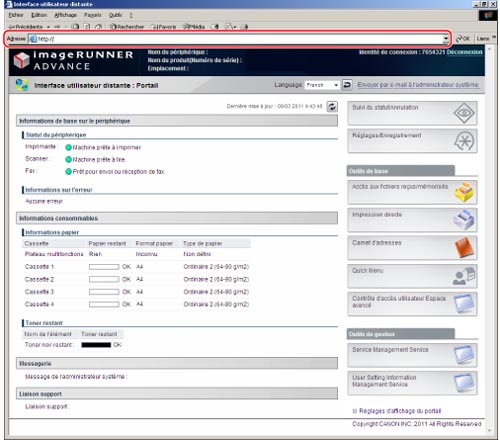 Adresse e-mail définie pour la machine imageRUNNER ADVANCE