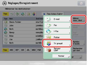 → [Définir destinataire] → [Mémoriser les destinataires] → [Mémor. nouv. dest.] → [Tri groupé].