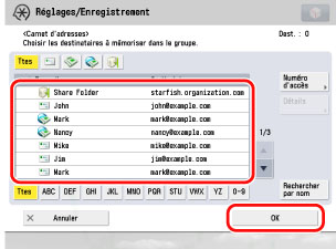 Appuyer sur [Ajouter depuis Carnet adr.] → sélectionner les adresses e-mail à mémoriser dans le groupe → appuyer sur [OK].