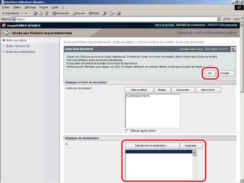 Définir l'adresse du destinataire sur l'écran Envoi → cliquer sur [OK].
