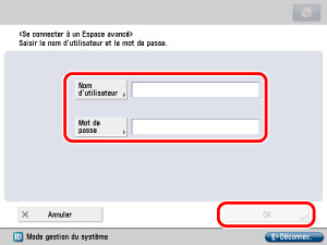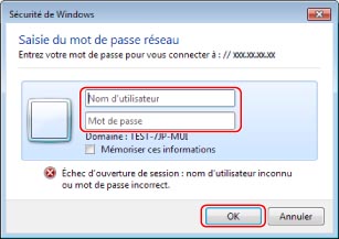 Saisir le nom d'utilisateur et le mot de passe définis à l'étape 5 de la section " Mémorisation des informations utilisateur" → cliquer sur [OK].