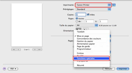 Sélectionner l'imprimante à utiliser → sélectionner [Fonctions spéciales].