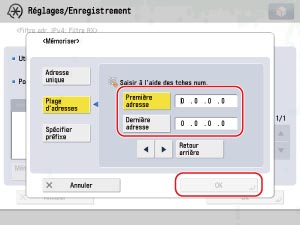 Appuyer sur [Plage d'adresses] → [Première adresse] et entrer "192.31.255.1" → appuyer sur [Dernière adresse] et entrer "192.31.255.254" à l'aide des touches