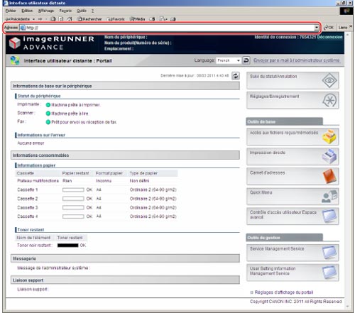 Démarrer un navigateur Web → saisir l'adresse IP de la machine dans [Adresse].