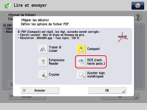 Si [Régler les détails] ne s'affiche pas, appuyer sur la touche [OCR(rech. texte poss.)] de l'écran Format de fichier → passer à l'étape 7.