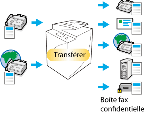L'imageRUNNER ADVANCE permet de transférer les documents reçus par télécopie vers différentes destinations. Configurez les paramètres de transfert en enregistrant les conditions de transfert et de destination. Vous pouvez définir pour destination un dossier partagé sur le réseau. Pour davantage d'informations sur la configuration du transfert, consultez l'e-manuel de l'imageRUNNER ADVANCE.