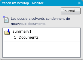 Vous pouvez utiliser Desktop Monitor pour surveiller les dossiers de destination du dossier dynamique. Configurez les dossiers à surveiller avec l' iW Desktop et autorisez la notification pour la présence de nouveaux documents, et une icône et une fenêtre de notification de nouveau document apparaîtront lorsqu'un document sera transféré du dossier dynamique à un dossier de destination.