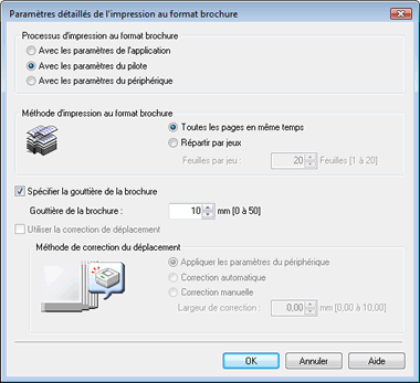 Pour effectuer une correction des décalages, sélectionnez [Avec les paramétres du périphérique] sous [Processus d'impression au format brochure] dans la boîte de dialogue [Paramètres détaillés de l'impression au format brochure] du pilote de l'imprimante. Il est impossible de configurer la correction des décalages si [Avec les paramétres du pilote] ou [Avec les paramétres de l'application] sont sélectionnés. L'imprimante doit également être dotée d'un finisseur piqûre à cheval en option pour pouvoir effectuer la correction des décalages.