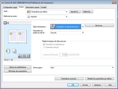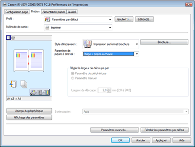 Lorsque vous sélectionnez [Booklet Printing] dans [Style d'impression] de l'imageRUNNER ADVANCE, le bouton [Paramètres détaillés de l'impression au format brochure] devient actif. Lorsque vous cliquez sur le bouton [Paramètres détaillés de l'impression au format brochure] , la boîte de dialogue [Paramètres détaillés de l'impression au format brochure] s'affiche.