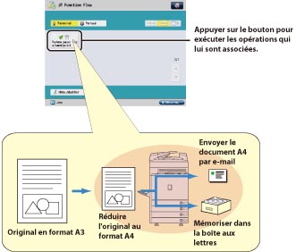 Vous pouvez par exemple lire un original A3, le réduire au format A4 et envoyer le fichier par e-mail tout en mémorisant une copie de sauvegarde du fichier dans une boîte aux lettres d'une simple pression sur une touche de flux.