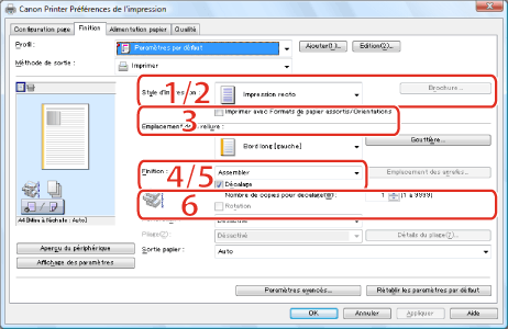 Pour imprimer au recto des pages uniquement ou au recto verso. [Style d'impression] a pour valeur par défaut [Impression recto verso]. Cependant, avec certaines versions du pilote, la valeur par défaut est [Impression recto] (voir "Impression recto et Impression recto verso").