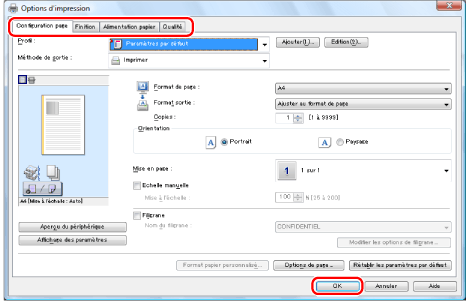 [Style d'impression] a pour valeur par défaut [Impression recto verso] dans la feuille [Finition]. Cependant, avec certaines versions du pilote, la valeur par défaut est [Impression recto]. Pour plus d'informations, voir "Impression recto et Impression recto verso".