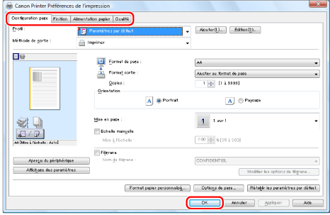 Pour modifier les paramètres d'impression par défaut, se connecter à l'ordinateur en tant que membre du groupe Administrateurs ou Utilisateurs avec pouvoir.