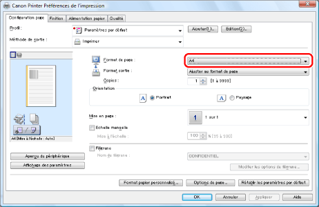 Dans [Format de page], sélectionner le format de page du document créé dans l'application.