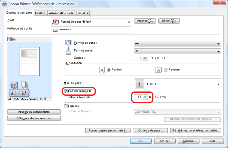La mise à l'échelle du document s'effectue automatiquement en fonction des paramètres définis dans [Format de page] et [Format sortie].
