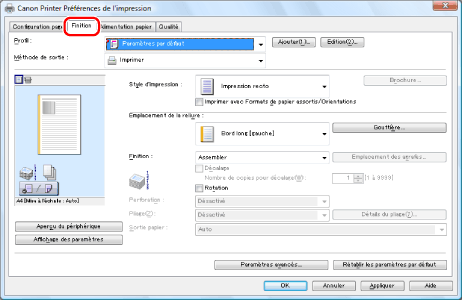 Il est impossible de définir les options de [Finition] dans la feuille [Finition] lors de la réalisation d'une impression au format brochure.