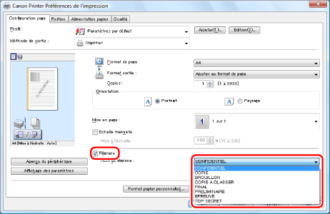 Il est possible d'imprimer un filigrane (tel que CONFIDENTIEL ou COPIE) sur un document créé à l'aide d'une application. Il est possible également d'enregistrer des filigranes personnalisés qui viendront alors s'ajouter aux filigranes prédéfinis.