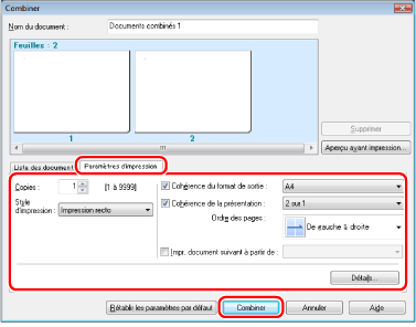 Pour modifier les réglages d'impression du fichier combiné, cliquer sur [Paramètres d'impression] → définir les réglages souhaités → cliquer sur [Combiner].
