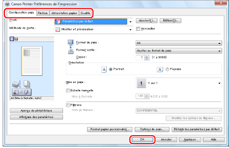 Définir les réglages souhaités dans l'écran de configuration d'imprimante →cliquer sur [OK].