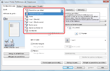 Des combinaisons de paramètres du pilote d'imprimante correspondant à divers objectifs d'impression sont proposés avec le pilote sous le nom de profils. Cela permet d'imprimer des documents en fonction de l'objectif souhaité par la simple sélection d'un profil dans la liste [Profil].