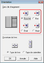 Pour les originaux recto verso, choisir l'option [Ouverture du livre] pour indiquer le rapport entre le recto et le verso d'un original recto verso.