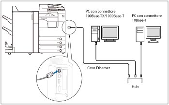 Se si utilizza un ambiente misto 10Base-T/100Base-TX/1000Base-T, è necessario che le periferiche in rete (hub, router e così via) supportino l'ambiente misto. Per ulteriori informazioni, rivolgersi ad un rivenditore autorizzato Canon.