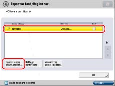 Per controllare per quali voci venga utilizzata una determinata coppia di chiavi, nella schermata Chiave e certificato selezionare una coppia di chiavi con l'indicatore 'Utilizzo' visualizzato per <Stato>, quindi premere [Visualizzaz. posiz. utilizzo].