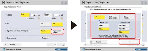 Selezionare [Impostazioni manuali] per <Algoritmo autenticaz./crittografia> → specificare l'algoritmo di autenticazione e protezione da applicare a IKE SA → premere [OK].