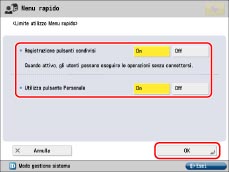 Solo il gestore del sistema, l'amministratore di sistema SSO-H (Administrator), l'amministratore della rete (NetworkAdmin) o l'amministratore della periferica (DeviceAdmin) possono configurare le impostazioni di limitazione dell'accesso al Menu rapido. Per informazioni sui tipi di amministratori, vedere "Impostazioni amministratore".