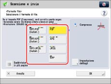 Consente di inviare il file nel formato TIFF (Bianco e Nero) o PDF (Scala di grigi/Colore). Se si seleziona questo formato di file, nella schermata delle funzioni principali di scansione e invio viene visualizzato [TIFF/XPS].