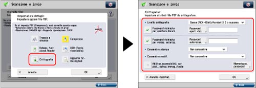 Richiamando le impostazioni dei file PDF crittografati da [Impostaz. preceden.] non viene richiamata la password e i contenuti dei campi [Password apert. doc.] e [Password autorizzaz.] vengono azzerati.