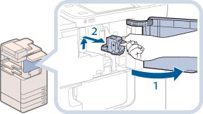 2. Tirare verso l'alto ed estrarre il portapunti dall'unità di pinzatura tenendolo dalla linguetta verde. |