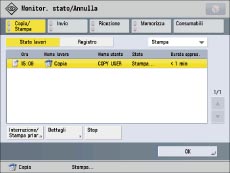 , viene visualizzata la schermata Monitoraggio stato/Annulla, dalla quale è possibile controllare e variare lo stato dei lavori di copiatura/stampa, invio, ricezione e memorizzazione.