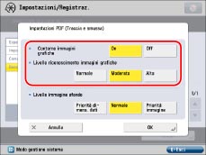 Se si aumenta <Livello riconoscimento immagini grafiche>, aumenta anche la dimensione dei dati. È consigliabile selezionare dapprima il livello [Normale] e, se il risultato ottenuto non è soddisfacente, provare ad aumentare il livello impostando [Moderato] o [Alto].